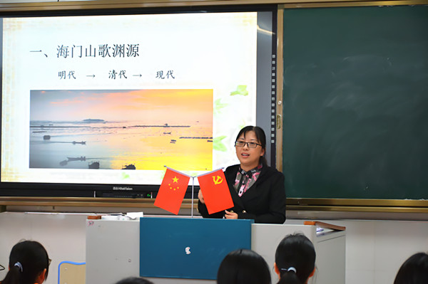 本节课从海门的精神文化生活导入,从海门山歌的渊源讲起,从别具风味的海门地方歌谣切入,和同学们一起探讨了海门山歌的脉系与发展,从内容、音乐、演唱三个方面分析了海门山歌的特点。通过任务驱动、小组讨论的方式,将海门山歌的代表作品进行拆分和讲解来掌握特点,从而达到突破重点、化解难点的目的。最后,以一曲海门通东童谣《春夜喜雨》的跟唱,在激情洋溢的学习氛围里结束了本堂课。
