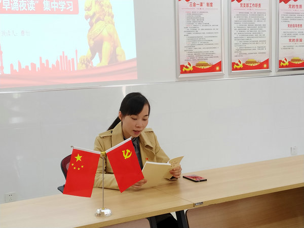 本次诵读由支部成员曹怡领学,她首先强调了本次读书活动的重大意义,随后率先带领大家共同学习了《习近平关于“不忘初心、牢记使命”论述摘编》第二章。曹怡指出,面对世界经济,局部冲突,全球问题加剧的外部环境,面对我国经济进入新常态等一系列深刻变化,我们还要紧紧围绕在习总书记身边,坚持稳中求进,迎难而上,开拓进取。