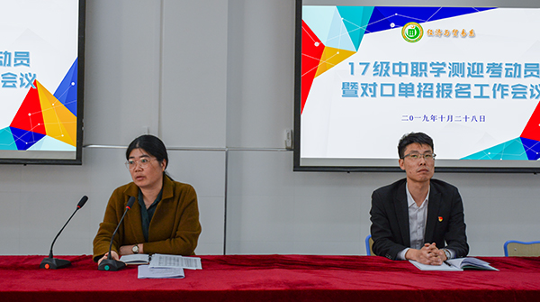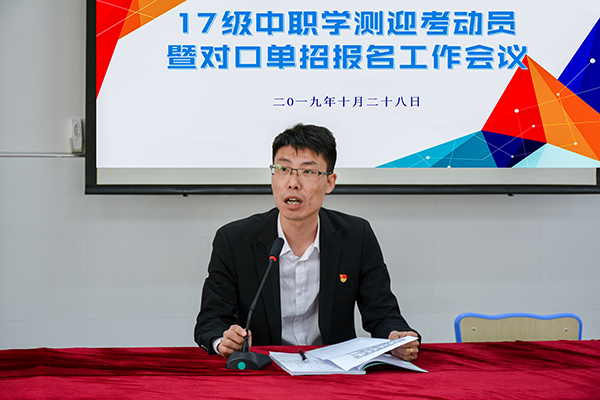 2019年江苏省中等职业学校学生学业水平考试将于下周末进行,为进一步营造浓厚的备考氛围,激发学生的学习热情,确保考试顺利进行,经贸系于10月28日在203召开了17级中职学生学测迎考动员会。经贸系主任施红华、副主任陈忠平,17级中职全体学生、班主任参加了动员会。动员会由施红华主持。