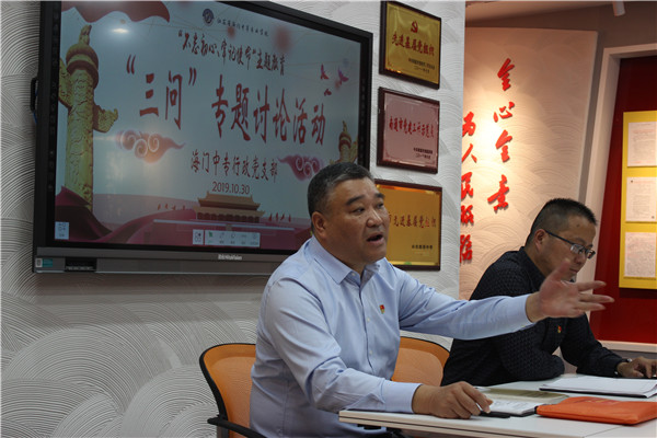 根据学校“不忘初心、牢记使命”主题教育领导小组办公室关于深入贯彻在“不忘初心、牢记使命”主题教育中开展“三问”的相关要求,引导支部党员结合实际深入思考担当作为、砥砺奋斗的核心理念,行政支部于10月30日下午四点在A楼11楼砥砺厅召开了“初心是什么、使命干什么、奋斗比什么”的专题讨论会。支部全体党员、入党积极分子参加了此次会议,会议由支部书记洪龚明主持。 第一项议程是由支部书记洪龚明领读、全体支部党员齐读《党章》中关于全心全意为人民服务的基本要求。 第二项议程是由党员代表陆晓曦同志领读习近平总书记关于《中国特色社会主义是历史的结论、人民的选择》最新重要讲话文章。 第三项议程交流讨论,由支部书记带头发言,支部党员结合工作实际,围绕“三问”发表自己的看法,总结提炼初心使命的具体标准。杨一丹、王勤荣和范丽萍三位党员积极探讨“初心是什么、使命干什么、奋斗比什么”,不管是杨一丹同志的“初心追问”,还是王勤荣同志的“奋斗表态”,抑或范丽萍同志的“坚守宣言”,都表达了在不懈的奋斗中助推学校教育教学高质量发展的决心。“心中有梦、肩上有责,奋斗不息”是大家共同的誓言。 此次“三问”专题讨论会意义重大,先不断追问,后不断反思,行政支部党员在追问和反思中获得更多前进力量。