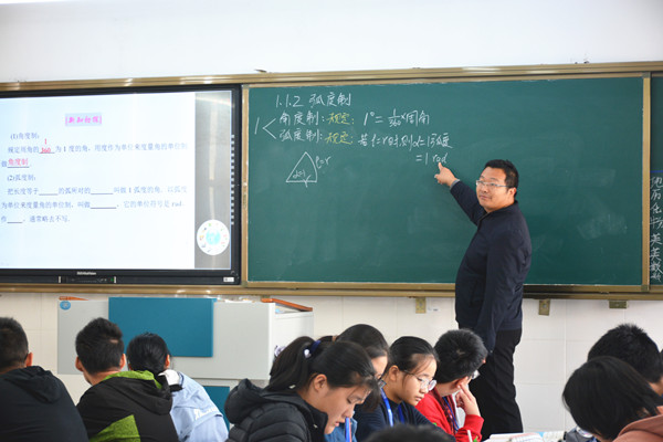邓振宇老师在19G03班开设的是题为《弧度制》的研讨课。邓老师通过复习角度制引入新知弧度制,并结合图像加深对弧度含义的理解,进一步推出已知弧长和半径时的弧度公式。邓老师从半圆出发, 完成了角度与弧度的换算。紧接着,用两个例题和两个练习来巩固新知。最后,运用扇形圆心角和圆周角的比例关系原理,推导出扇形的弧长和面积公式,让学生发现圆心角、半径、弧长、面积四者可以“知二求二”。最后由学生来总结回顾本节课的知识点。本节课邓老师运用了PPT、电子白板、实物投影、黑板等多种教学媒体,让学生通过小组学习、合作探究的方式进行学习研究,效果良好。