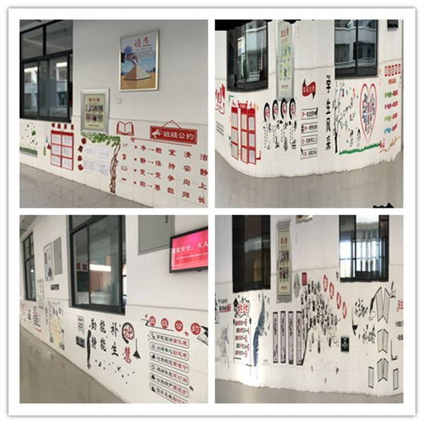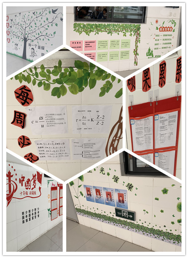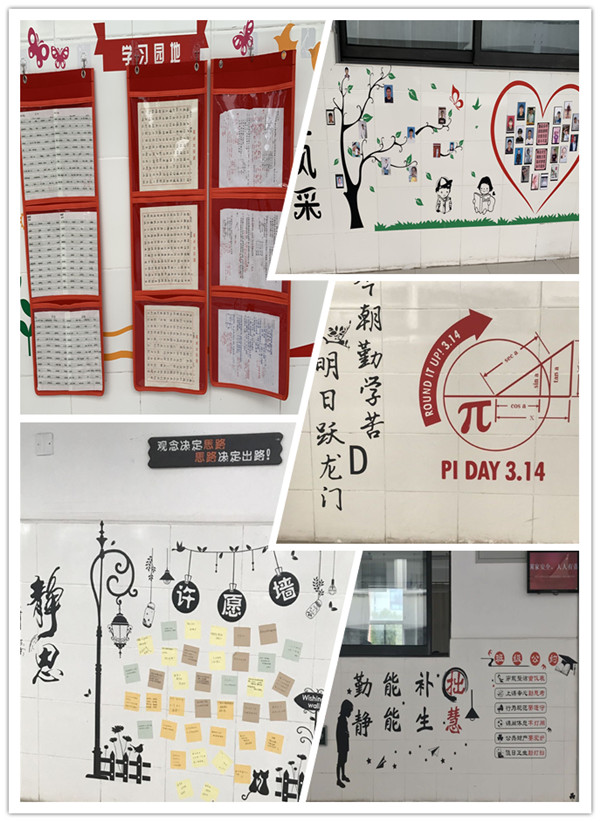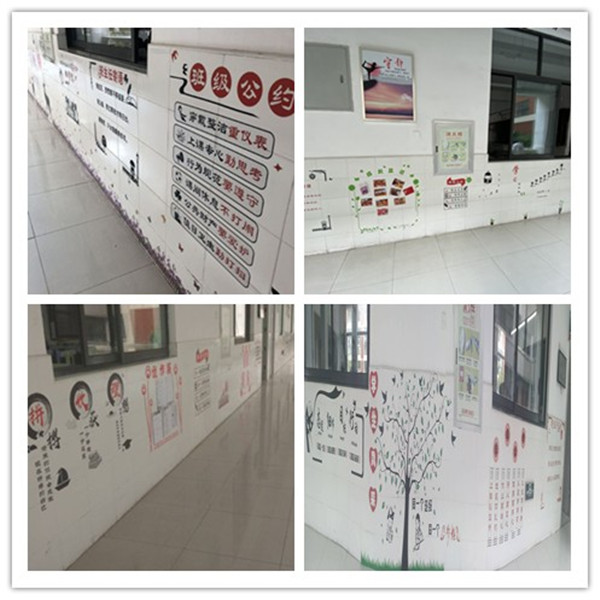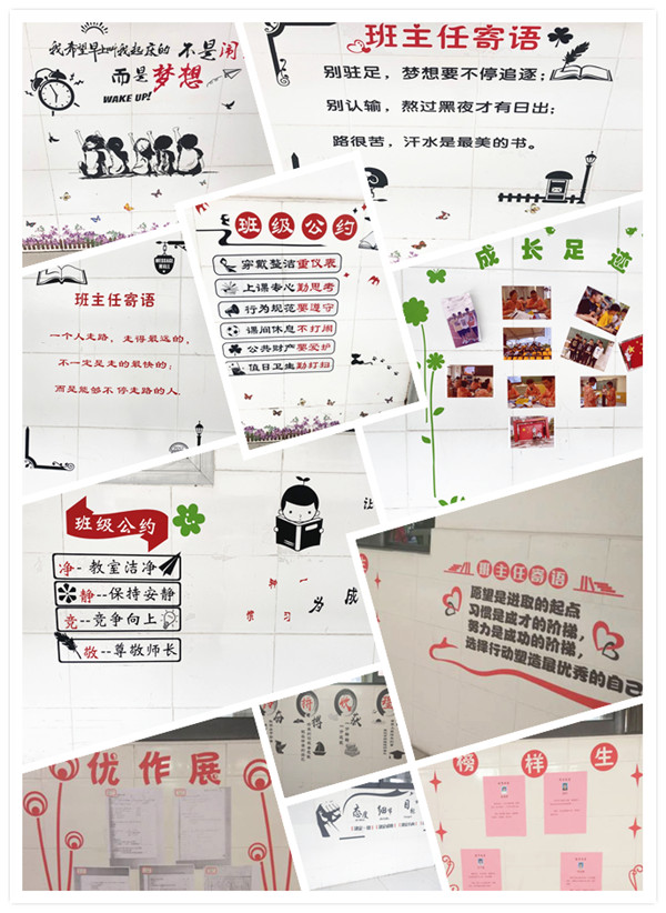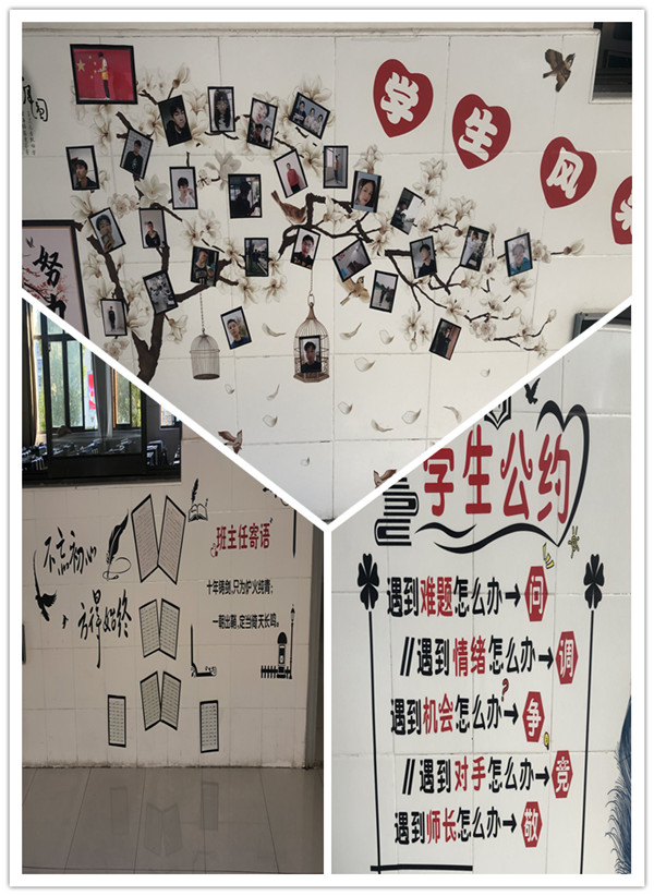 各位班主任积极开动脑筋,发动学生一起为自己的教室外墙布置想办法、出主意。经过师生一周的精心策划和布置,各班的教室外墙布置不仅优美而且各具特色,营造出了一个个主题鲜明、色彩和谐的班级文化氛围。创意无限,精彩纷呈。许多教室布置与班级文化、班级管理相结合,有的班级贴着《班级公约》,时时提醒学生遵章守纪,尊敬师长,懂得基本礼仪,懂得怎样和同学和谐相处。有的班级贴着全班学生的大头照,显示着整个班级的凝聚力和学生风采,大家看后纷纷赞叹。“班主任寄语”传达着老师的谆谆教诲,寄托着老师的殷切期望,“光荣榜”“优作展”彰显着榜样的力量,为同学们树立好标杆。班训、个人励志名言、理想目标设计等等布置,使教室文化内涵丰富,展示着班级亮丽的风景。18级每个教室外墙布置都构思巧妙、美观新颖、有创意、有特色,让每一面墙壁都“说话”,达到“润物细无声”的教育目的。很多学生都说:“走过这样的教室外,迎面扑来的是一股文化的气息,我就会自觉的安静下来,品味其中的味道……”