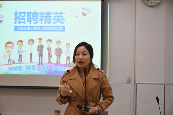 为解决我系毕业学生的就业问题,让学生提早适应求职现场,了解当前就业的趋势,2019年11月19日下午14:00分,经贸系组织了“华淼金服科技有限公司”、“謇公湖国际大酒店”、“苏宁易购”、“顺丰速递”四家公司在C2-203举行了企业招聘宣讲会。系部主任施红华、企业工作人员、2020届应届毕业生参加了本次宣讲会。