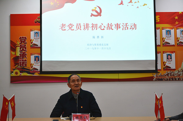 11月19日下午15:05,经贸系党支部开展了老党员讲初心故事学习教育活动。本次活动邀请了优秀老党员施惠新同志主讲,系部全体党员和入党积极分子参加。这堂别开生面的党课为大家开展了一次“不忘初心 牢记使命”的主题教育,也展现了老一辈党员干部较高的党性觉悟和理论水平。