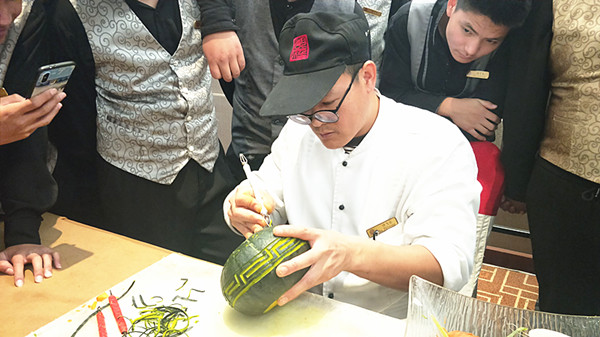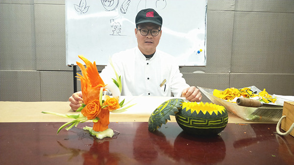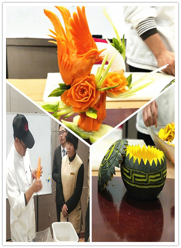 许师傅这次为学生们培训的内容为果蔬食材的雕刻技法。在两个小时的时间里,许师傅运用各种雕刻技巧,让手中的各种果蔬变成了一件件精美的艺术品,而且在演示制作过程中和学生们分享了自己在雕刻过程中的一些独门心得,让在场的每一位学生都受益匪浅。
