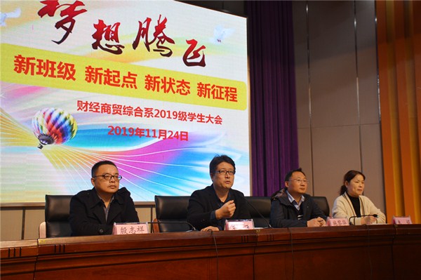 为帮助2019级学生尽快适应分专业后的新环境,及时对他们进行思想政治及行为规范教育,11月24日上午10:20,财贸系在文苑报告厅召开了2019级全体学生大会。王飞主任主持会议并主讲,施黎华、殷志祥、朱娟副主任均参加了本次会议。