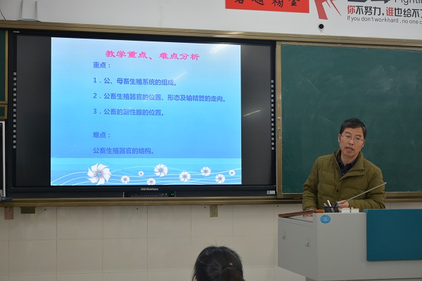 第二课由陆祖明老师在17EZ09班开设了一堂题为《家畜生殖系统》的市级公开课。陆老师从知识准备、问题探析、拓展训练、巩固练习四个环节层层深入。从考纲要求入手,确立课堂教学目标;用历年高考典型题,激发学生浓厚的探索欲望;教学知识重点突出,紧紧抓住教材要点,学生以练为主,让学生能上手,使学生尽快适应高考节奏。