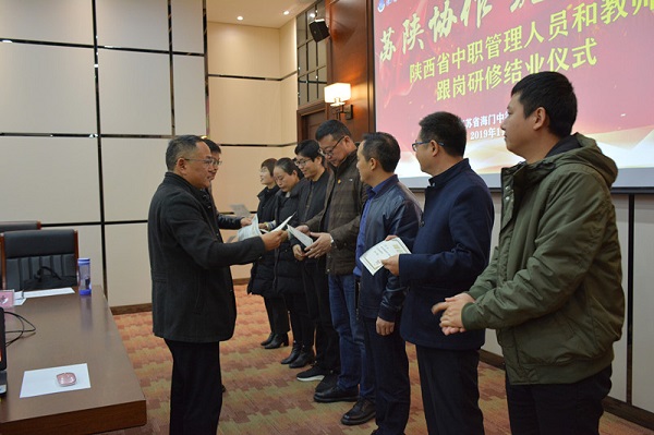 11月29日上午,由陕西省教育厅、江苏省教育厅主办,我校承办的2019年苏陕协作项目——陕西省中职管理人员和教师跟岗研修班结业仪式暨学习成果汇报会在图文信息大楼2楼阿里厅举行。结业仪式由科研工作部主任杨一丹主持。