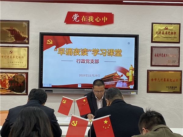 根据学校主题教育领导小组通知要求,为了更好地开展“不忘初心、牢记使命”主题教育,11月29日下午2:30,行政党支部在图文信息大楼“砥砺厅”开展11月主题党日活动。党委书记宋健、副校长周卫星、王小辉等党委委员作为普通党员参加了双重组织生活会,活动由支部书记洪龚明同志主持。活动共分三项议程。 首先洪龚明给全体党员上了一堂题为《新思想领航,落实新发展理念》的专题党课。洪龚明结合学习新思想谈了自身的认识和体会,并刀刃向内主动进行自身差距和存在不足的剖析,最后洪龚明指出,全体党员要真懂真信真用,要擦亮政治底色,积淀精神力量,发挥引领作用,一路奔向海专梦的新时代,为领航学校建设贡献力量。 会议的第二项议程是“早诵夜读”学习课堂。蔡文宇同志带领全体支部党员学习了《习近平关于“不忘初心、牢记使命”论述摘编》的第九章《开展调查研究、全面增强执政本领》相关段落,全体支部党员边倾听边深思,对文章中相关重点内容及时作标注,诵读结束后,杨云和赵建平对所学内容进行了感悟分享,他们提到,我们要明确为“谁培养人,培养什么样的人”的历史使命,明确责任,主动担当,用出色的业绩回报党和人民。 第三项议程是相关工作布置。洪龚明梳理下一阶段的工作任务和工作方向。下周将要召开组织生活会和民主评议党员活动,下下周将迎接海门市示范党支部的“回头看”验收,全体党员要以昂扬的姿态,做好分内工作,确保“最后一公里”的平稳落地。 本次党日活动既学习了习近平新思想,又明确了具体工作方向,会后全体支部党员将继续在理论方面提升自己,在不断找差中寻找更优秀的自己。
