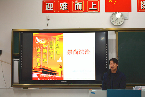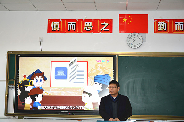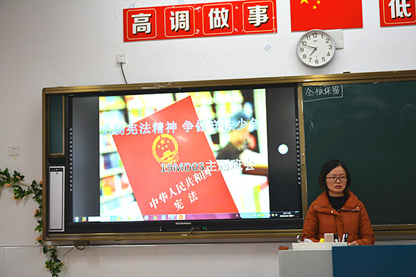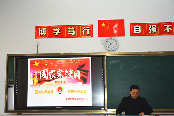 各班主任精心准备,整理学习内容。班会课上,教师以讲解、问答、案例分析等形式,向学生进行宣传教育。宪法是国家的根本大法,是治国安邦的总章程,是党和人民意志的集中体现。同学们在老师的引导下积极参与交流与讨论,更加明确了《宪法》在我国的重要地位,是其他法律的依据,并且感受到了学习宪法的必要性。同学们纷纷表示,要自觉遵守国家法律,从身边的小事做起,人人做遵法守法的好少年。