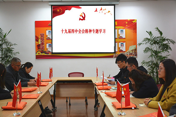 首先陈忠平同志对全会精神进行传达与导读。会议指出,党的十九届四中全会从党和国家事业发展的全局和长远出发,开启了国家治理体系和治理能力现代化建设新征程。充分体现了党中央高瞻远瞩的战略眼光和强烈的历史担当,对决胜全面建成小康社会、全面建设社会主义现代化国家,对巩固党的执政地位、确保党和国家长治久安,对推进中国特色社会主义伟大事业,实现中华民族伟大复兴中国梦,具有重大现实意义和深远历史意义。