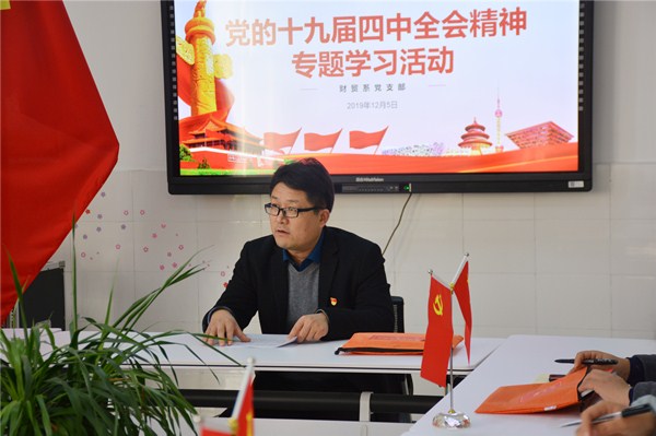 根据《市委教育工委关于全市教育系统深入学习宣传贯彻党的十九届四中全会精神的通知》要求,依照学校党群工作部统一部署,12月5日下午13:45,财贸系党支部全体党员在D226党员活动室集中学习了十九届四中全会精神,本次学习活动由支部书记王飞主持。