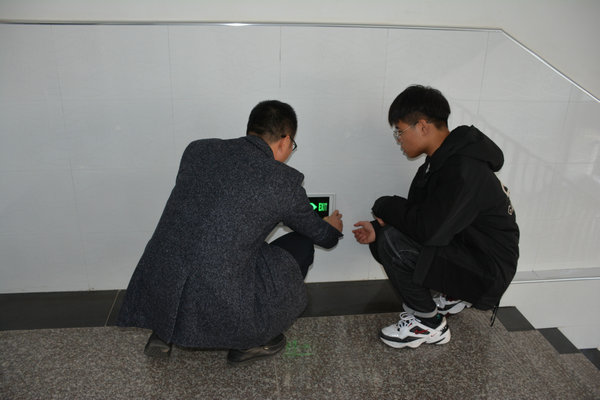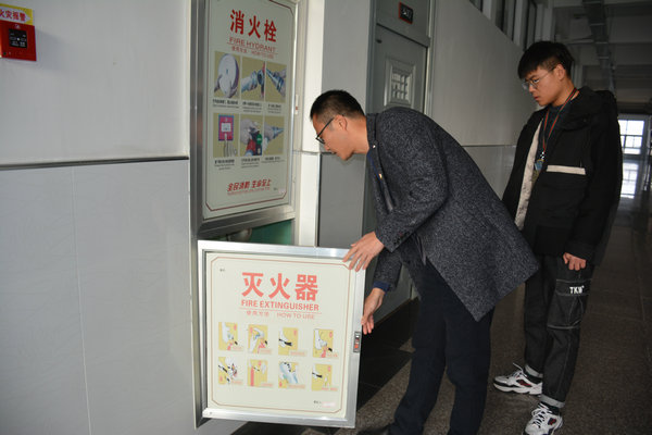 沈豪杰主任带领学生会干部对教室进行逐间、逐楼检查,查找是否存在门窗损坏、墙面脱落、消防设施、用 电等安全隐患。在排查过程中,沈主任发现有个别楼道安全指示牌有所损坏,及时进行了报修处理。