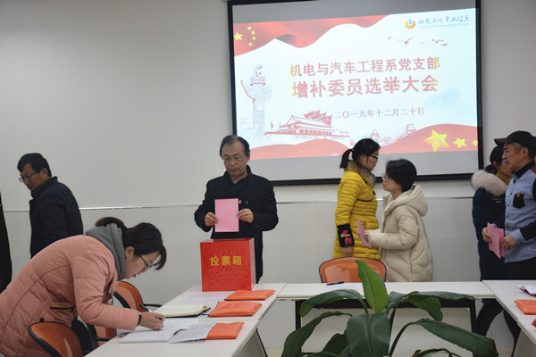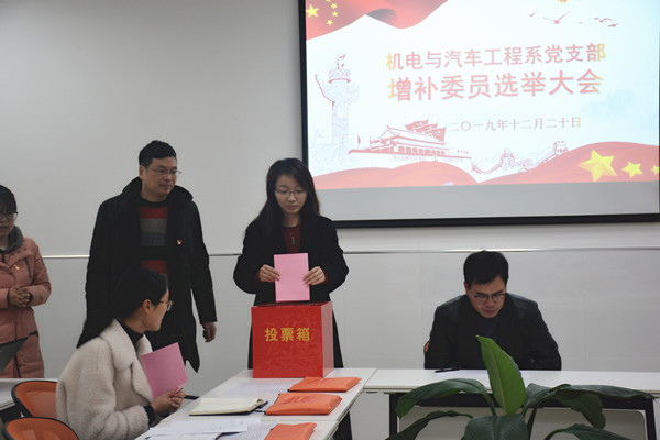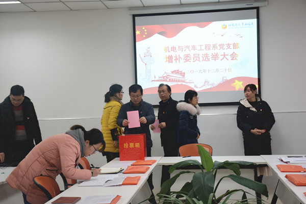 为保证支部工作有序开展,更好地发挥党支部的战斗堡垒作用,根据《中国共产党章程》及《中国共产党基层组织选举工作暂行条例》等规定,经中共海门中等专业学校委员会同意,机电与汽车工程系党支部于2019年12月20日上午9点30分,在文苑楼234会议室召开支部增补委员选举大会。大会由党支部书记吴樱樱同志主持,支部14名党员参加会议,联系支部的党委委员、副校长王小辉同志全程监督选举过程。