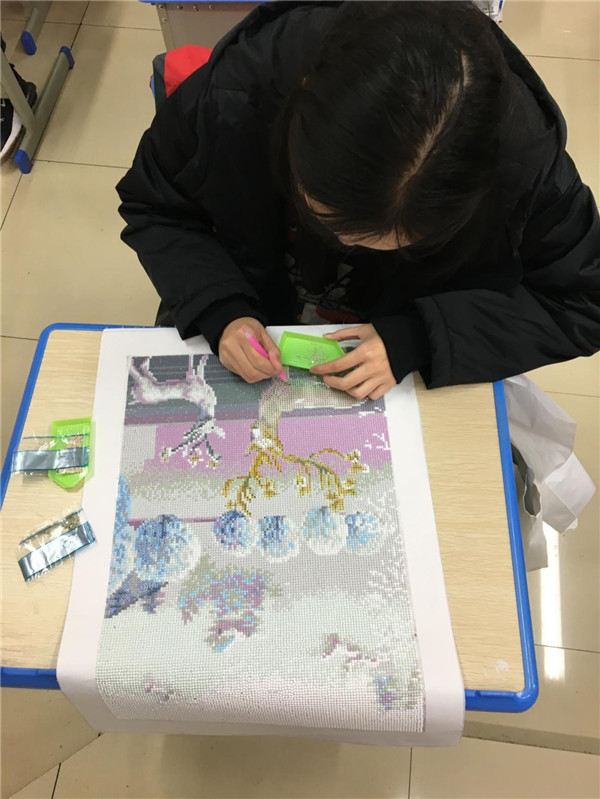 本着以学习为目的,以兴趣为纽带,社团指导老师李建梅对同学们进行了钻石绣的启蒙教育。初步掌握钻石绣的基本技能,学生们便兴致高昂地投入钻石绣的创作中了。
