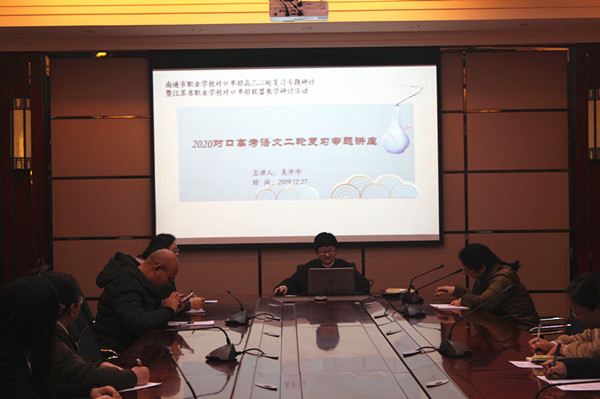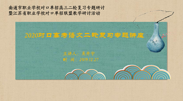 12月19日、20日,南通市一模考试如期举行,这就意味着对口单招一轮复习的结束,二轮复习的开始。工作室全体围绕本次语文学科一模质量分析,纵横比照,商讨对策。 12月26日,海门市第三次髙研会的召开,不仅总结了一轮复习的得失,更为二轮复习指明了方向,设定了目标。工作室黄娟老师作为高三备课组长,在会上作主题发言,从分析不足中汲取教训,明确潜力,找准方向。 12月27日,省市二轮语文学科复习研讨活动在海门中专举行。全省34所学校53位语文老师参加了教研活动。省单招联盟语文基地负责人吴开宇老师开设了二轮复习专题讲座,工作室成员启东中专袁海英老师和黄娟老师分别开设了两堂二轮专题复习公开课。 黄娟老师的《广告词写作讲评课》主要针对学生在应用文写作中普遍存在的格式、语言、内容方面的问题,指导学生进行诊断分析和修改。黄老师以联合体考试和南通市一模应用文答题情况为依据,分析了学生在应用文写作上的主要难点,从学生习作出发,明确了学生在广告词写作上的盲区。整堂课以诊断为主线,以分析修改为呈现形式,让学生在分析欣赏中明确问题,在诊断修改中掌握技巧。