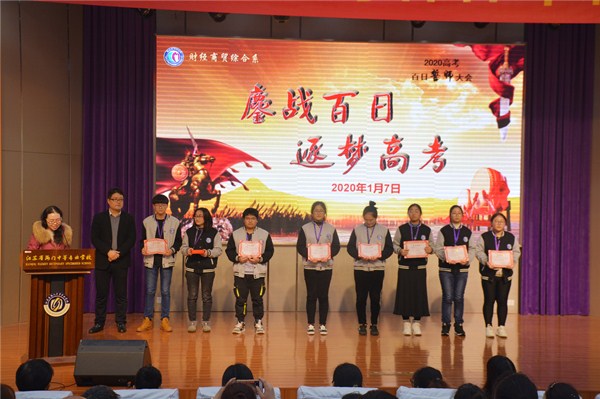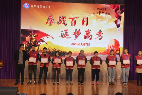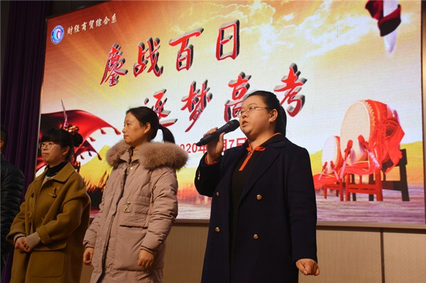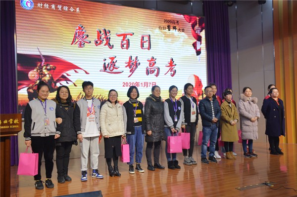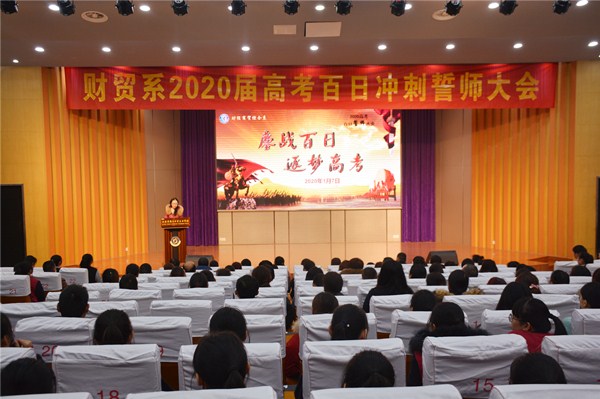 1月7日下午13:20,财贸系17级高三全体学子和部分家长代表齐聚文苑报告厅,参加系部组织召开的2020高考百日冲刺誓师大会。财贸系主任室全体成员及17级高三班主任与会,学校党委副书记、副校长周桂岐出席大会,大会由徐杨帆科长主持。