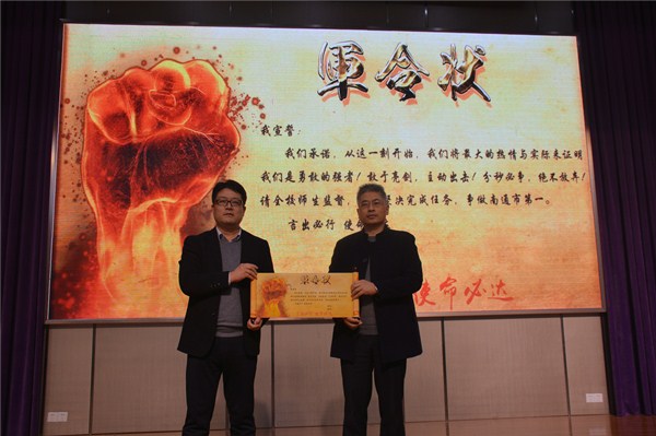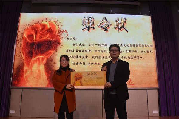 议程五是递交“军令状”。周英老师代表全体老师向王飞主任递交了写满各班高考目标的“军令状”,而王飞主任也向周桂岐副校长递交了“军令状”,保证完成2020单招高考系部目标。