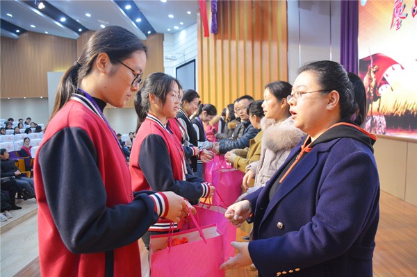 议程七是班主任送祝福。17级高三各班主任走上前台,依次为同学们送上美好祝福,同时赠送给同学们每人一份礼品——“成功笔”和“幸运袜”,拳拳之心,砥砺前行。