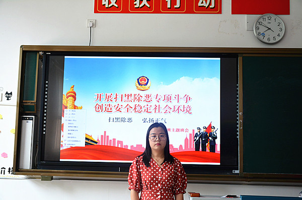 各班级围绕主题精心准备,采取班会的形式,通过视频、图片等资料介绍了黑恶势力、违法犯罪给社会治安带来的危害。学生们也深入体会到校园欺凌行为造成的生理和心理的伤害,大家学习在遇到黑恶势力及校园欺凌时应该怎样正确应对,以此增强学生扫黑除恶反欺凌意识,提升自我安全防范能力。