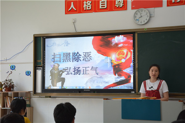 活动中,首先各班班主任利用多媒体给学生详细介绍了扫黑除恶相关知识,特别针对“校园欺凌”的危害进行了着重讲述。然后,学生观看班主任精心准备的视频和PPT等扫黑除恶专题教育材料,让他们对黑恶势力有了更加深入的了解,以及当收到黑恶势力威胁时如何保护自己。最后,在班主任的引导下学生围绕如何做遵纪守法好公民、杜绝黑恶势力等内容展开了讨论。