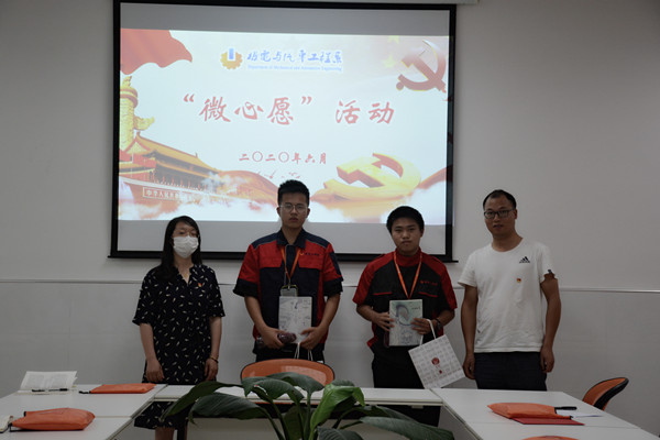第三项议程,微心愿活动。活动前期,机电系党支部根据实际情况,经过摸排和筛选,最终确定18JZ04杜秋霖和17JD03黄誉樊两名同学作为微心愿对象。一本书、两本笔记本、一把雨伞、一个保温杯……对我们来说是一件很小的事情,但对于心愿人来说却是他们梦寐以求的向往和期待。小小行动,关爱不止;小小礼物,仁爱不尽。携手“微心愿”,汇聚正能量是一项长期的事业。让我们共同努力,将微心愿行动汇成爱心暖流,滋养他们渴求的心灵,让学生感受到党的关爱、我们的温暖,让德润之光照耀大地!