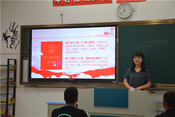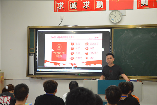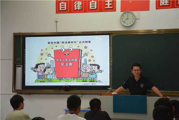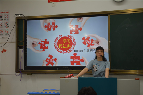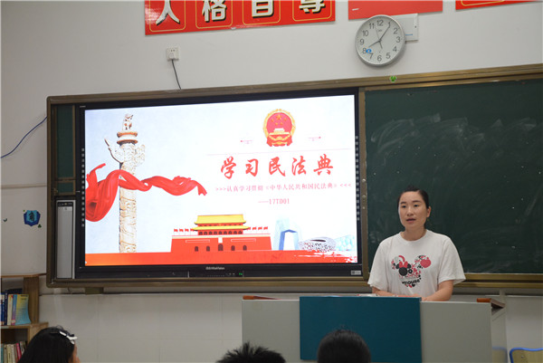 活动中,班主任首先利用多媒体,根据课前精心制作的PPT向同学们讲解了《民法典》出台的背景、宗旨原则和主要内容,使学生对《民法典》有了初步的了解。接下来,在班主任的引导下,同学们围绕《民法典》结合生活中的应用展开了积极的讨论,让学生对于“社会百科全书”民法典有了更深刻的认识。最后,班主任希望同学们利用课余时间积极学习《民法典》,做一个尊法、知法、守法的好公民。