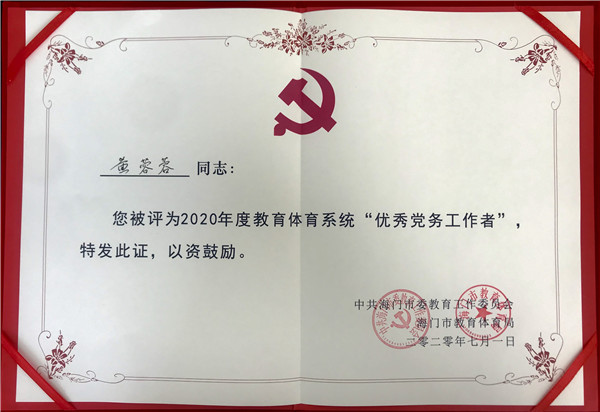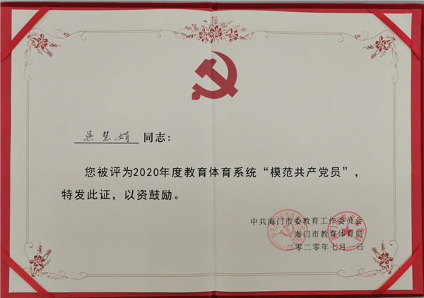 6月30日上午,海门市教育体育系统“七一”表彰大会在海门中专謇公湖科教大会堂隆重举行。 在本次表彰大会上,海门中专党委和部分党员接连获得殊荣:海门中专党委获评“海门市教体系统先进基层党组织”;海门中专党群工作部副主任黄蓉蓉获评“海门市教体系统优秀党务工作者”;海门中专党员吴慧娟、陈俊获评“海门市教体系统模范共产党员”。除此之外,海门中专党委申报的学校“廉”文化获评为“海门市教体系统‘一校一品’优秀党建品牌”。这些先进集体和个人在海门市教体系统党建和学校事业发展中充分发挥党组织战斗堡垒作用和党员的先锋模范作用,让我们向榜样看齐,学先进、勇担责、作贡献,为建设“领航新海专”和“强富美高新海门”作出自己的贡献。 一直以来,海门中专党委以开展“不忘初心、牢记使命”主题教育为契机,以创建“海门市示范党支部”为目标,坚持真抓真学真严,强化专责专长专注,不断强化战斗堡垒,发挥先锋模范作用,推进支部建设全面进步全面过硬。海门中专党组织将以本次表彰作为新的起点,再接再厉、再创辉煌!(党群工作部 姜彦辰)