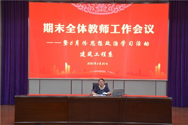 为保证期末各项工作有序、高效、顺利进行,6月30日下午3:50,建筑工程系在文苑报告厅召开了全体教师工作会议暨六月份思想政治学习活动。