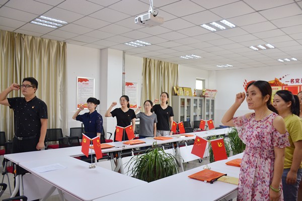 第三个议程是重温誓词。与会党员全体肃立,高举右拳,在王飞同志带领下,重温入党誓词。铮铮誓言,承载了党员教师们的诺言和责任。