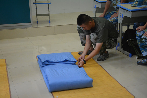 内务整理中最难上手的无疑是折叠棉被了,教官亲自示范,边操作边讲解,就折叠的尺寸、虚部掏实、压平、两次对折等手法一一讲解,当同学们看到不成形的被子被教官叠成了有棱有角的“豆腐块”时,他们惊讶、敬佩,同时也有自己能叠好被子的信心。