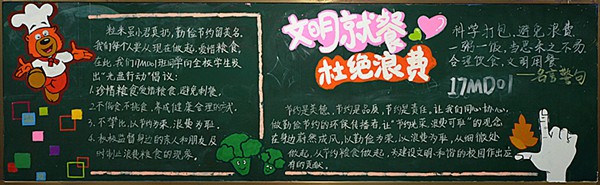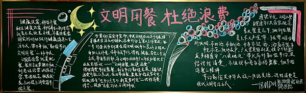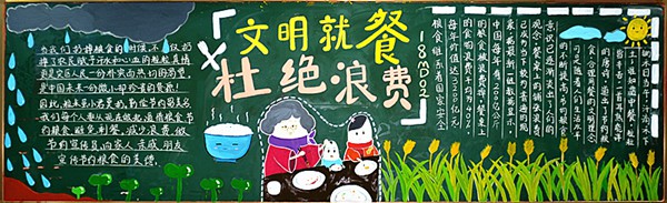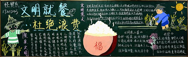 餐桌文明是社会文明的重要体现。小餐桌,大文明,承载的不仅是人类的生生不息,更传承了中华民族的优秀文化和尊重劳动、珍惜粮食、勤俭节约的传统美德。9月上旬,经贸系组织了“文明就餐,杜绝浪费”主题黑板报评比活动。