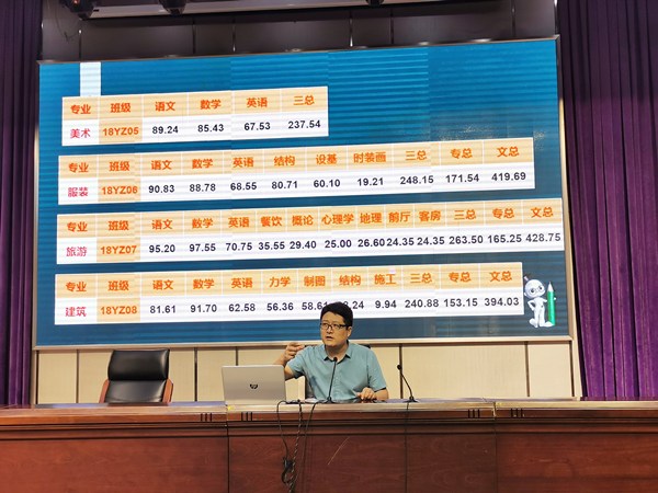 首先王主任对暑期作业检测情况进行了会诊把脉,肯定了本次考试中取得的成绩,通过系部层面文化课成绩、各专业同轨班级专业成绩、高分段人数的分布等不同角度的分析,表扬了一批榜样学生,同时也剖析了数据背后透露出的问题,指出本届高三尚有很大提升空间。