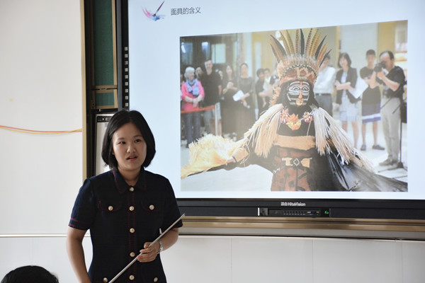 朱蓓雯老师首先播放了一段川剧变脸视频并提出问题进一步引出课题:面具设计制作。教学过程中,朱蓓雯老师通过几组图片的对比展示了面具的发展演变;从国内外的面具赏析引导学生思考面具设计制作要点,提高学生审美水平;通过分组设计制作面具锻炼学生动手能力和创新能力。本节课综合性较强,突出自主探索与师生互动,将面具文化融入到美术课中。朱蓓雯老师精心设计了教学内容,准备了丰富的教具材料,针对重点难点反复讲解,设疑引导,让学生自主观察分析,归纳总结并动手制作,学生课堂兴趣高涨,在浓厚的文化氛围中提升了学生的审美水平,更锻炼了学生的动手能力。