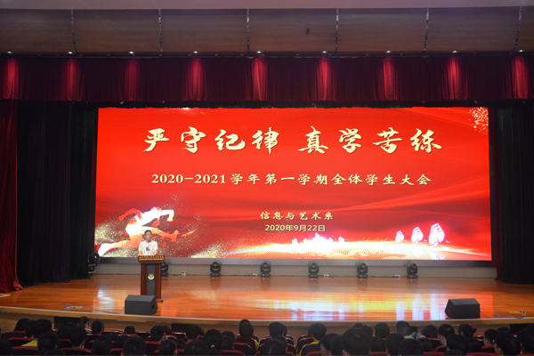 为进一步提高教学质量,加强系部管理,把学风、系风建设做到更好,9月22日上午9点50分,信息与艺术系在謇公湖科教大会堂隆重召开新学期全体学生大会。信息系徐亮主任、陈建华副主任、沈豪杰副主任、周莉副主任、全体班主任以及全体学生参加了本次会议。会议由沈豪杰副主任主持。