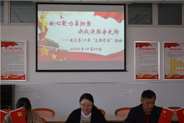 10月23日上午10点30分,根据校党委的统一安排部署,建工系党支部全体成员在B2楼214党员活动室组织开展了10月份主题党日活动。此次活动的主题是“凝心聚力勇担当,决战决胜争先锋”。此次主题活动主要围绕“5+X”开展。