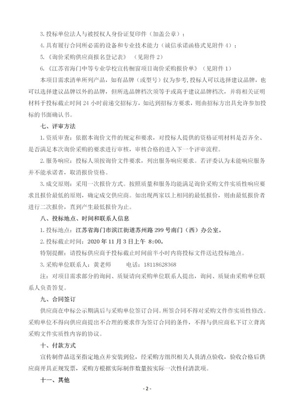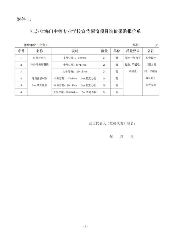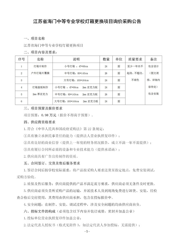 江苏省海门中等专业学校灯箱更换项目询价采购公告