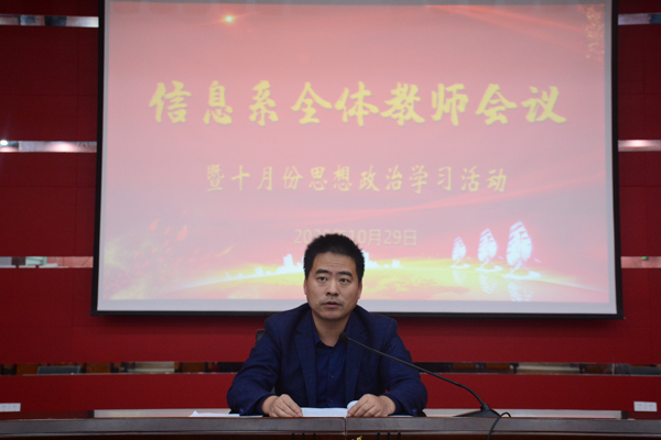 为总结前一阶段情况,加强教育教学管理,部署安排下一阶段工作, 10月29日下午15:10,信息系在H楼报告厅召开全体教师会议暨10月思想政治学习活动。会议由徐亮主任主持。