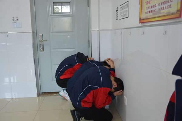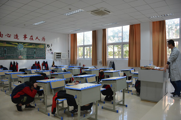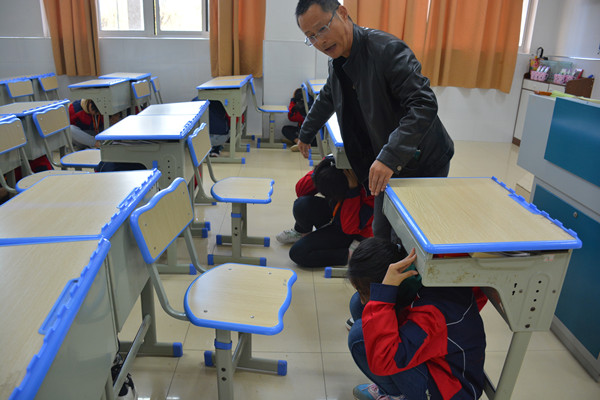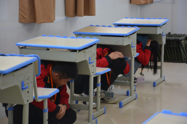 地震警报拉响后,班主任迅速组织、指导室内的学生马上就近躲避,身体蹲下、低头、脸朝下,两只胳膊在额前相交,前额枕在臂上,闭上眼睛和嘴,用鼻子呼吸。班主任提醒指导同学们身体尽量蜷小,躲到坚固的桌子下或有三角区的墙角,以保护头部和身体。待“地震”平息,警报解除后,同学们又井然有序地回到座位上。