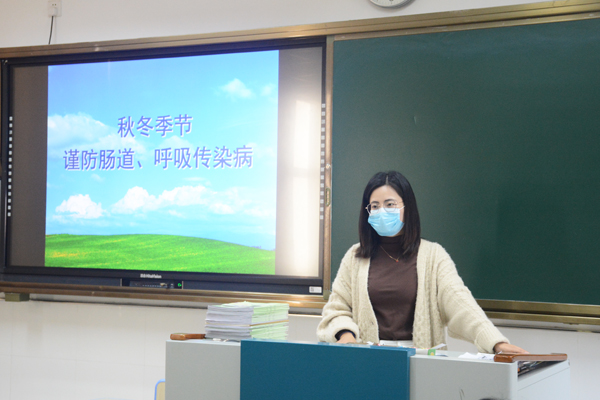 班会课上,各班主任结合PPT就常见传染病的特征、预防和控制等方面对学生作了详细的讲解,着重介绍了学生中常见的传染病:流感、水痘、肺结核等的症状、危害及如何预防,让学生们更多地了解秋冬季传染病防治的正确方法。班主任们或通俗,或简洁或精辟的语言让学生对传染病预防知识有了更多的了解。课上,老师们还建议学生平时应注意个人卫生、勤洗手,经常开窗通风,根据天气变化增减衣服,加强自身的锻炼,以提高自身的防病能力。