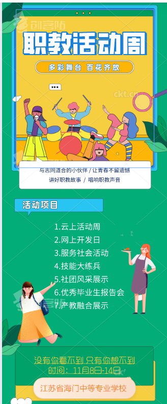 六、活动要求 1.精心组织,提高质量。各系、院及相关职能部门要高度重视,认真学习、领会国家、省有关通知文件精神,根据学校活动实施方案,结合本部门实际工作,精心组织、周密部署、落实责任、积极配合、共同参与,确保各项活动有效进行。 2.做好宣传,扩大影响。各系、院、部门要加大宣传力度,将活动开展情况在校园内网上进行报道,宣传办要对各系部的报道进行筛选,在外网专栏上进行发布,同时宣传办要利用报刊、杂志、电视台、微信等媒体及时做好活动的宣传、报道工作。 3.精细过程,及时总结。各系、院、各职能部门及时整理活动开展情况的原始材料,要求如下: (1)照片:JPG格式,图片宽不低于2000像素,单张不低于2M,请对每张图片配文字说明。 (2)视频短片:要求:200M以内,分辨率标清以上(建议 1280*720),格式为mp4。 (3)总结材料:要体现活动整体情况和特色,字数1500字。 上述材料报送时间: 11月14日晚前,打包发至李雅琴qq或邮箱。 (4)宣传办公室负责外网和官微职业教育活动周专栏信息的每日推送和维护、报送2-3个优秀案例和特色工作至市教育局新闻办。 (5)教学科研部按时将本次活动学校方案、2020年“职业教育活动周”主要活动安排表、总结报告及各项活动原始材料附件打包发至南通市教育局职社处。 4.加强防范,确保安全。安全保卫工作及防疫工作是确保活动顺利进行的重要环节。各系部门、安保处要根据活动安排,落实防疫要求,排查安全隐患,确保活动顺利完成。 江苏省海门中等专业学校 2020年11月2日