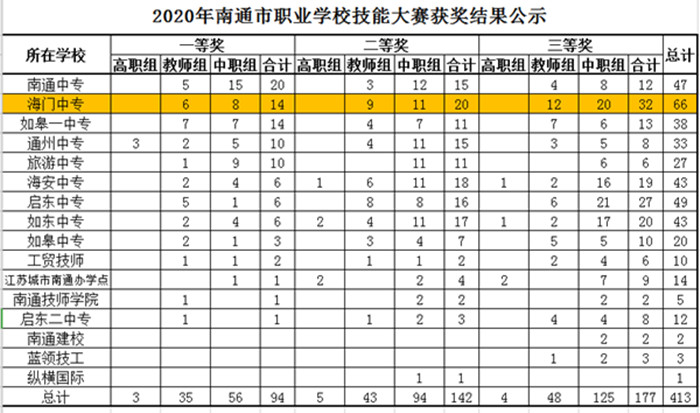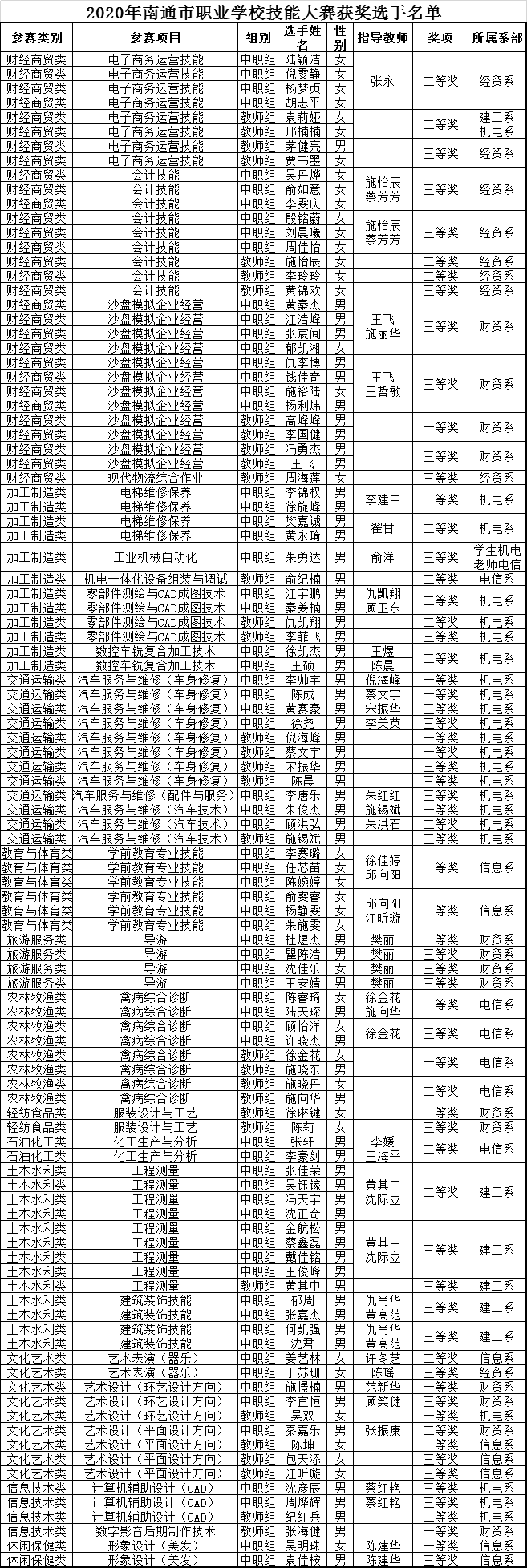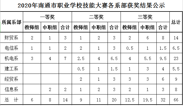 11月12日,南通市教育局正式发布南通市技能大赛结果。我校以获得一等奖14个、二等奖20个、三等奖32个、奖牌总数66个的好成绩,位列南通市总奖牌数第一、金牌榜第二。 本届市赛在参赛项目大调整、赛事规程大改革、备赛时间大压缩的基础上,无论是赛点组赛,还是参赛送赛等工作,我校上下均能快速应对,积极投入,全力以赴。海门中专在沙盘模拟企业经营、学前教育专业技能、禽病综合诊断、艺术设计、汽车服务与维修(车身修复)、电梯维修保养等项目中保持历年优势,同时在数字影音后期制作技术、形象设计等项目中均有一等奖的突破。 一份耕耘,一份收获。为了能在竞技场上与高手的过招中赢取胜利,参赛师生克服困难,苦练技能,精益求精;辅导教师兢兢业业,深研方案,把好方向。一次次的训练,一次次的指导, 最终拥有了战胜对手的实力与勇气。优异成绩的背后除了参赛选手和指导老师的不懈努力与全心付出,离不开学校领导高度重视和全力支持,离不开各系部的精心组织与全程关注。 近日,2021年江苏省职业院校高职技能大赛(高职组)选拔赛活动正在报名中,2021年省中职学校技能大赛的报名工作也即将启动。此外,本学期除南通市技能大赛,我校另有四名选手通过南通市选拔,入选第五届江苏技能状元大赛总决赛,他们将在11月中旬赴昆山与社会各领域精工巧匠同台竞技,力争开阔眼界,攀登技能新高地。 技能大赛是职业教育的试金石、风向标,是对学校办学水平的一种重要检验方式。相信在各大技能赛场上,我校全体参赛师生一定会同心同德,群策群力,以必胜的信念、扎实的作风和高度的责任心与使命感,继往开来,再创辉煌!