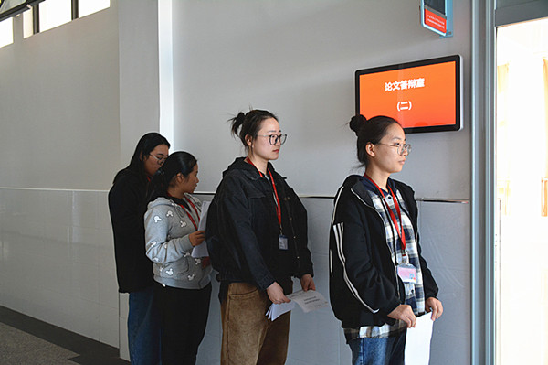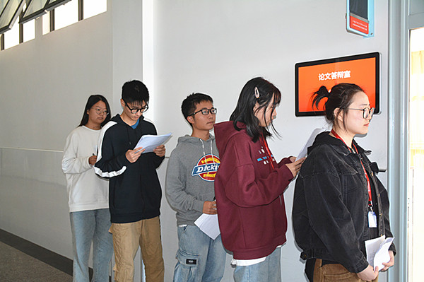 上午8:30论文答辩正式开始,学生们在答辩室前整齐排队等待,依次进入答辩室。学生首先简明介绍了毕业论文的总体框架和思路,陈述论文的核心内容,在5-10分钟内完成了陈述;