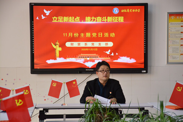 根据海门区委组织部和区委教育工委通知要求,在学校党委统一部署下,财贸系党支部于11月12日下午15:10,在謇公楼226会议室组织开展了11月份“主题党日”活动。本次活动以“立足新起点,接力奋斗新征程”为主题,由支部书记王飞同志主持,共包括五个议程。