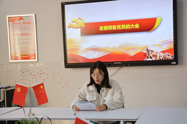 第四个议程是发展预备党员。包括了七项流程。第一项:发展对象杨滨榕同志宣读“入党申请书”,向党支部表明今后工作的态度和方向。第二项:入党介绍人汤健、吴慧娟同志介绍杨滨榕同志的现实表现,并对其能否入党表明意见。第三项:支部书记王飞同志汇报杨滨榕同志的审查情况。第四项:党内讨论。第五项:无记名投票。吴慧娟同志为计票人、汤健同志为监票人。第六项:根据监票人的报告结果,王书记宣布了表决结果,全票通过。第七项:杨滨榕同志表示非常感谢组织的培养与信任,将在今后的工作和生活中严格要求自己,虚心学习,积极工作。