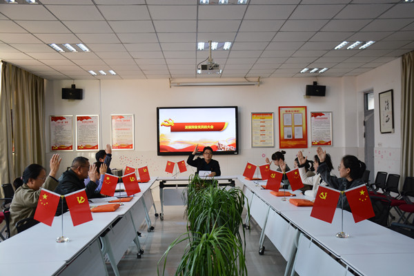 第三个议程是重温誓词。在鲜红的党旗前,每一位党员教师举起右手,字字铿锵,用重温入党宣誓,再次唤醒党员教师心里最初的入党之心,神圣纯粹、坚定无悔。