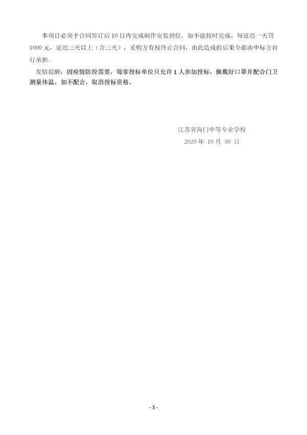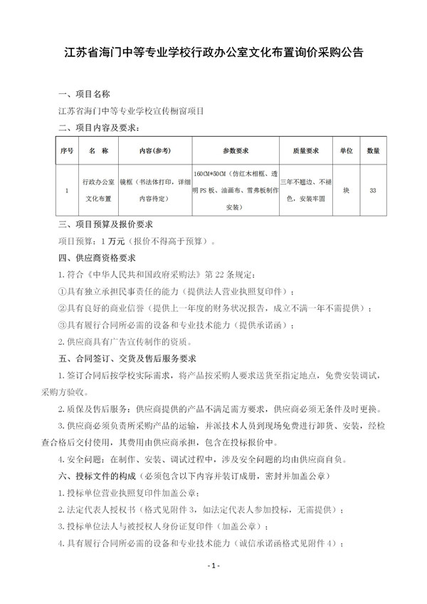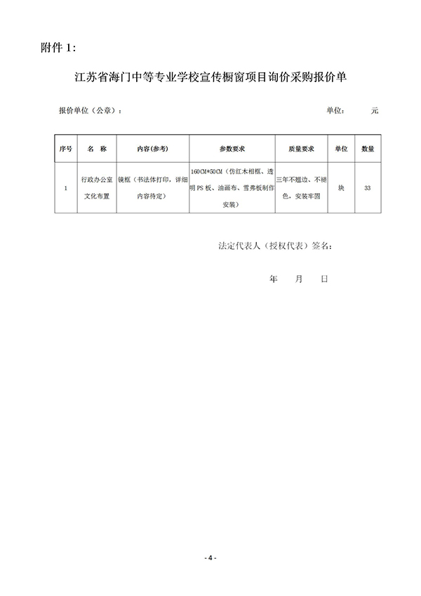 江苏省海门中等专业学校行政办公室文化布置询价采购公告