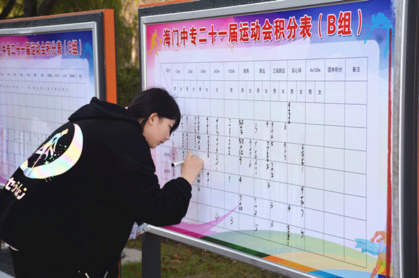 速度和热情,这是运动场上点与面的完美结合; 汗水和成功,这是每条赛道上相随相伴的挚友; 快乐和荣耀,这是体育竞技场永不停歇的追求。 11月13日至15日,海门中专田径赛场上举行了属于我们的盛会。 赛场实录,请您品鉴—— 红色跑道,发令响起,蓬勃少年便是你追我赶;最飒接力,接棒你我,传递团队荣耀集体荣光。 三级跳远,凌空起跳,克服引力最是令人惊艳; 跨越横杆,加速助跑,身姿飘逸勇敢跳过“地平线”; 圆球投掷,卯足精神,双臂甩出等待落地“花”开。 拔河赛场,赛前指导悉数传授,场赛加油响声震天;两军对垒,一鼓作气力求一举拿下。 赛前赛后,加倍的快乐源于一起分享,缓释的辛苦只因你我分担。 这就是体育的魅力,运动赛场是每个人的主场,这个过程“既是完成又是激励,随处都可到达终点却从不停歇,永远都在半道上,都与宇宙共振,生存于永恒之中”。 这一群人,前来助阵—— 校长前来观看,感受运动会的热情,也在巡检运动会工作的开展。 系部主任、班主任们总是在寻找自家的“孩子”,在赛场边上驻足凝视,就为一声“加油”。 红色背心,忙碌在赛场的周围,不管是维持秩序,还是帮忙“跑腿”,坚守是他们的工作作风,你们也很靓。 赛场周边,同样精彩—— 裁判处 争论判定是为公平公正,裁判员们的面红耳赤也是可爱生动的一面; 发令台 发令员老师,两耳不闻,目光如炬,凝神于跑道,聚心于发令; 计时处 比运动员还紧张,比裁判员还心颤。紧抓秒表,眼观跑道,手指轻点,计时开始; 播音台 重要信息电波传送,没有间歇,带有情绪的语言文字总能让赛场气氛升温; 登记处 比对再比对,确认再确认,成绩单需慎重填写,锱铢必较才是正确态度。 奖牌奖杯,属于所有追梦人 本次运动会设置最佳运动员单项奖、各组比赛单项奖和团体奖。(供稿:学生工作部 黄 娟)