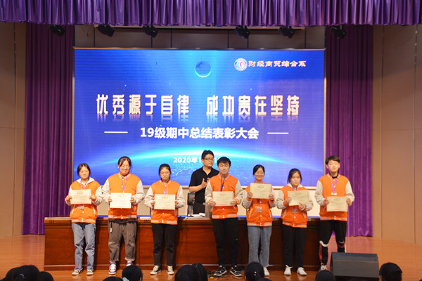 11月19日12:15财贸系在文苑报告厅召开19级期中总结表彰大会,全体高二学生及班主任全程参与了本次大会,会议由财贸系王飞主任主持并担任主讲。