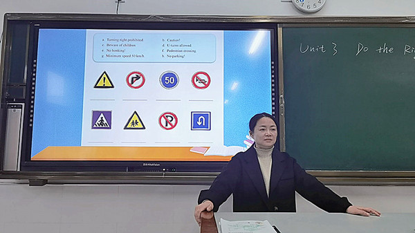 本节课,许老师精心设计了教学环节,利用多媒体手段展开教学。在课堂上,许老师在PPT上提供了许多图片帮助学生以讨论知识的方式引入新课,接着围绕“rule”这一主题继续展开教学。对学生来说,“rule”是较为熟悉的话题,尤其是日常生活中的交通规则到学校的行为规则。这节课是堂听说课,学生从说到听再到说进行课堂活动,并结合相关练习,最后让学生进行小组讨论、自主学习、成果展示。
